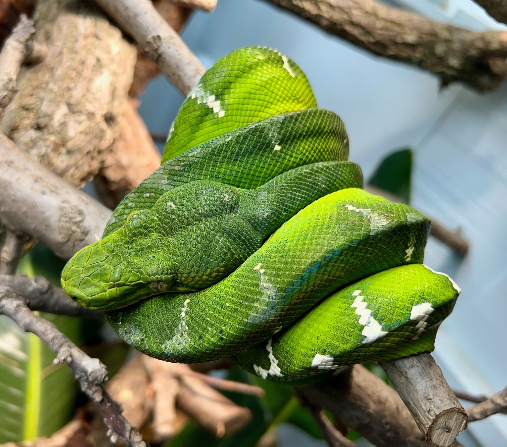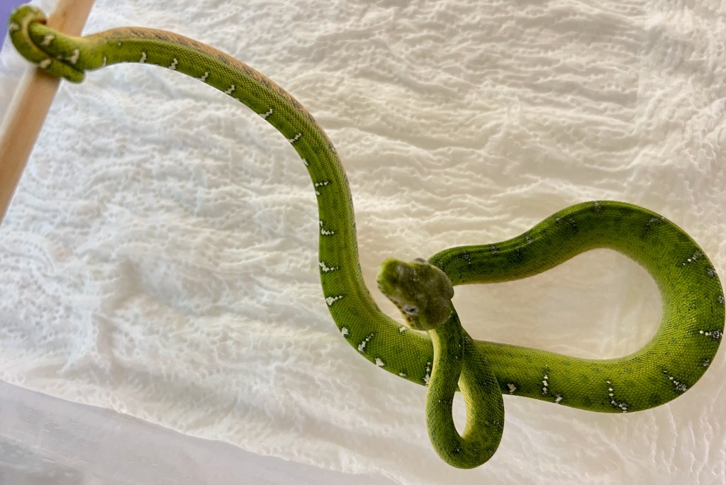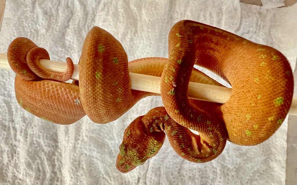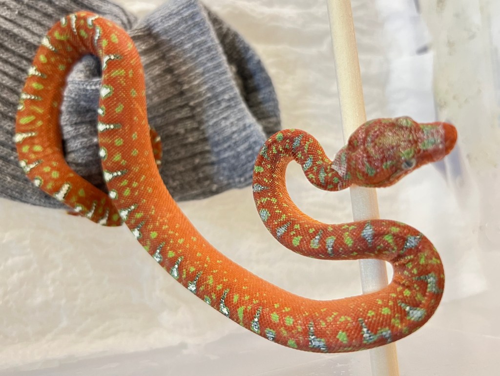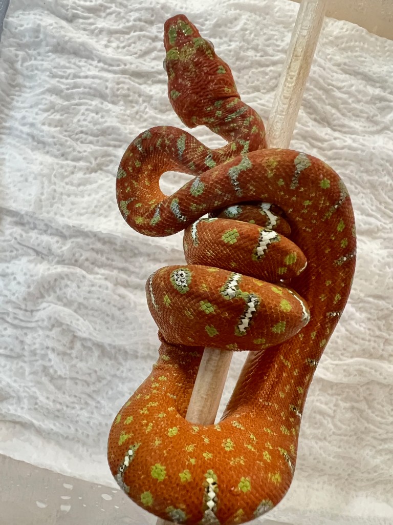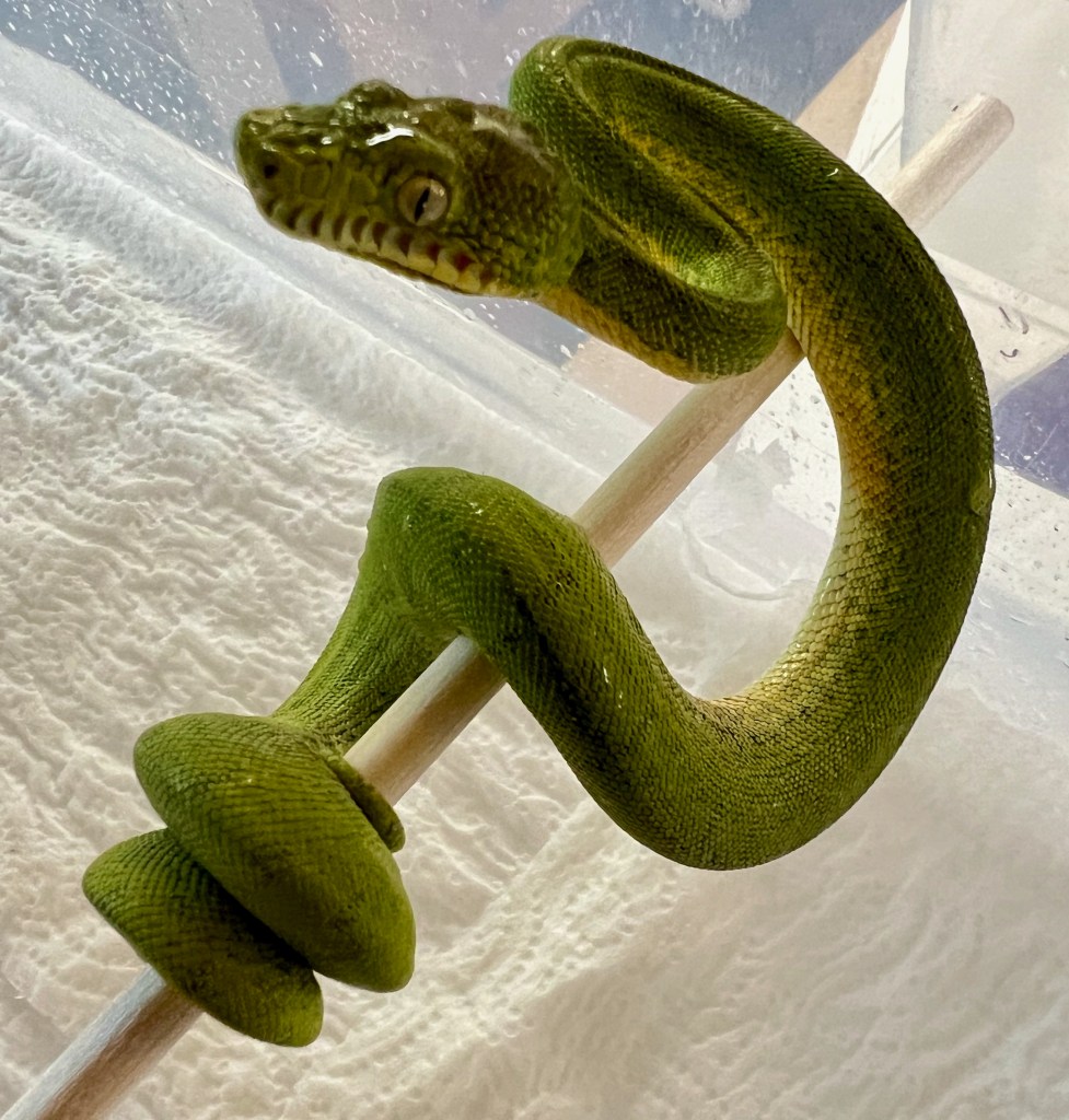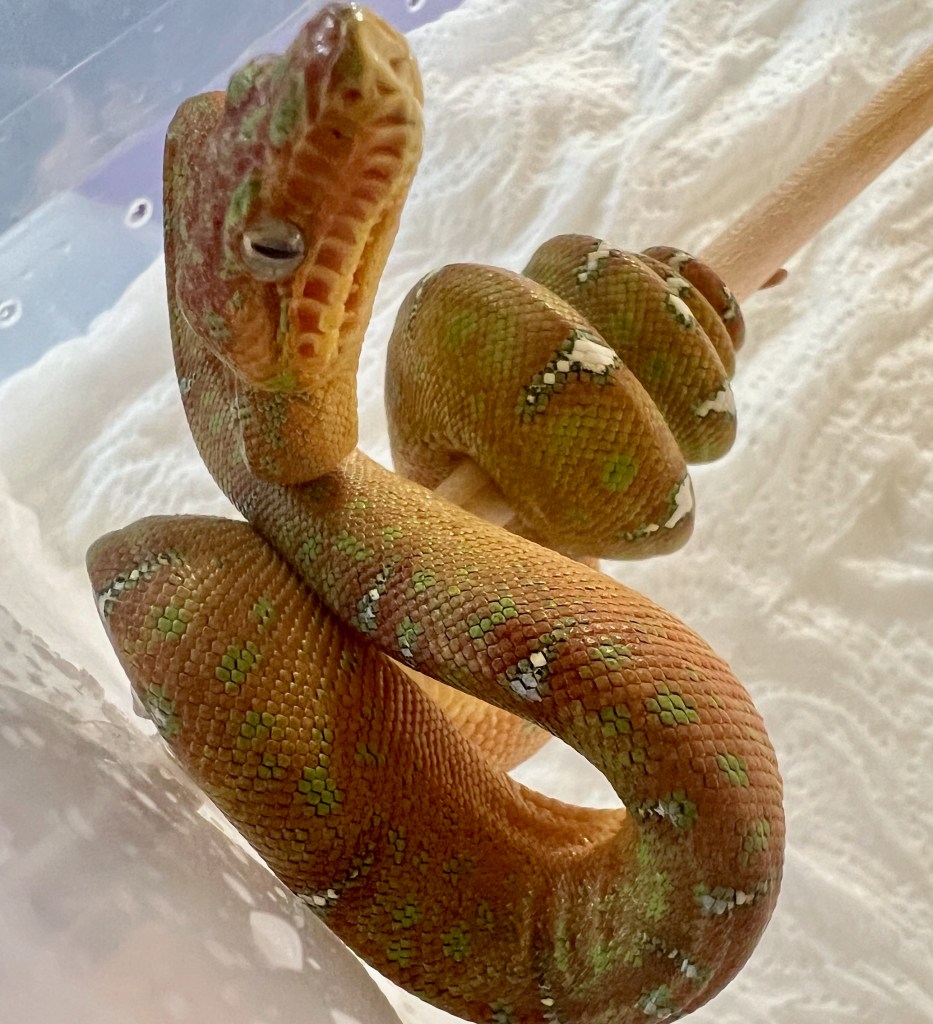 The cage is well ventilated and so have big temp gradients for the snakes to choose from. Temps in the cage range from the mid 90s under the halogen lamps and the DHP (deep heat projector) to the low 70s at the far corners away from the lamps. The babies thermo-regulate depending on their shed cycle, food intake, etc.