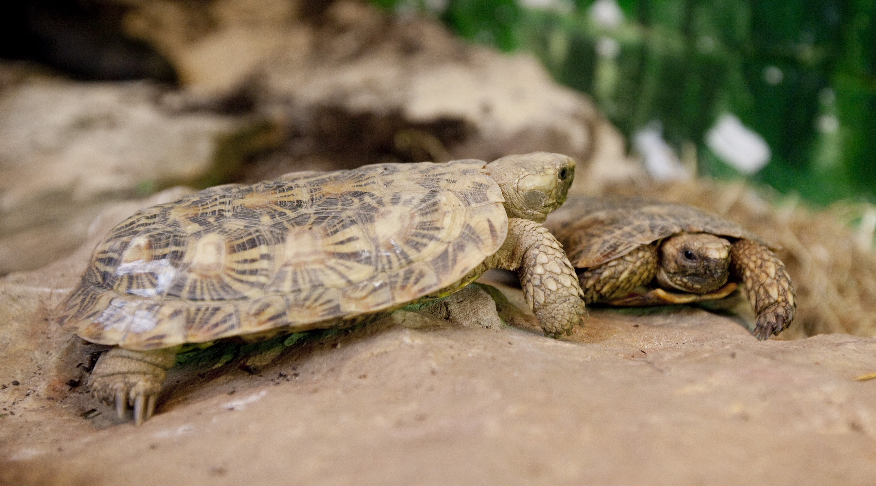This tortoise can certainly shift if it needs to and are and good climbers too. This proves very useful when they’re trying to avoid predators. When trying to hide they will wedge themselves in crevices (gaps in rocks) and puff up their body to wedge themselves so they can’t be pulled out. They do this in their enclosure at Folly Farm so don’t panic if you see them wedged sideways between two stones, it’s completely normal behaviour.